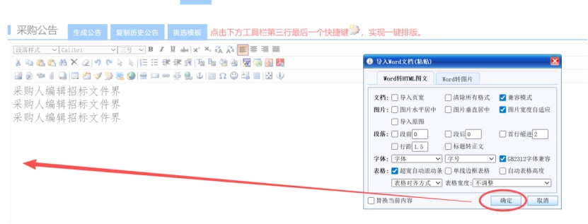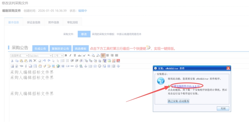 在进行采购公告等需要在页面上直接通过富文本编辑框进行编辑的页面,如果复制或者导入word文档(使用金山WPS或者微软Office文档)的内容,系统会自动提示安装eWebEditor控件,此时在弹出的对话框中点击“下载安装控件”即可:
