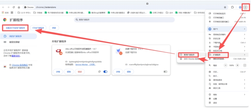 1.打开谷歌浏览【右上角三个点】-【扩展程序】-【管理扩展程序】-【加载未打包的扩展程序】
